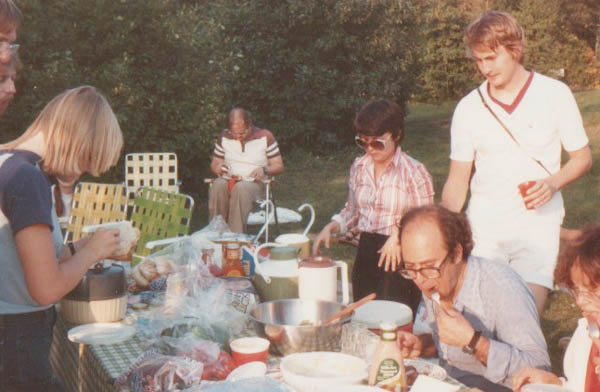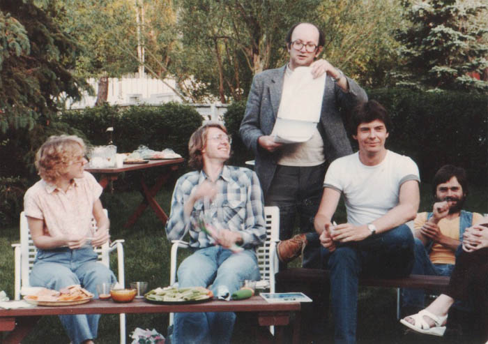 Department Picnic at Blackstrap (1981) [Left to Right: Howard Hamilton, Alan Friesen, Sharon Plumb, Darwyn Peachey, Judy Peachey, Hasan Reghbati, Dave Bocking, Gail Bunt] |