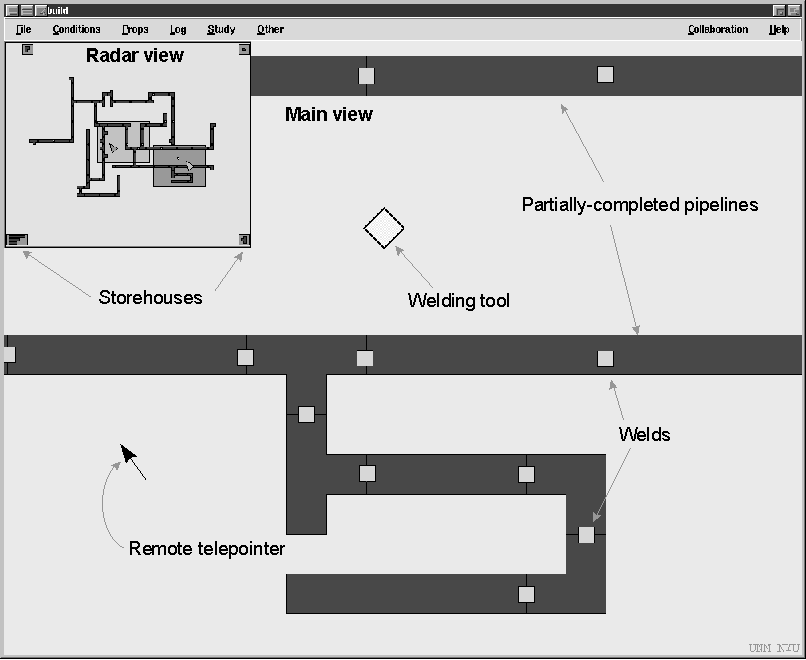 We are interested in groupware systems that allow small groups to collaborate in real time in a medium-sized visual workspace. Activities in these systems are organized around the creation, manipulation, and organization of artifacts in the workspace. We built such a system for this experiment, using the GroupKit toolkit (Roseman and Greenberg 1996) and the Pad++ drawing system (Bederson and Hollan 1994). The application was a pipeline construction kit that allows the assembly and manipulation of simple pipeline networks in a shared two-dimensional workspace (Figure 1). Users can create, move, and rotate sections of pipe, and can join or split sections using a welding tool. The workspace is rectangular, and four times larger than the computer screen in each direction. Users scroll around the workspace by dragging their cursor past the window border.