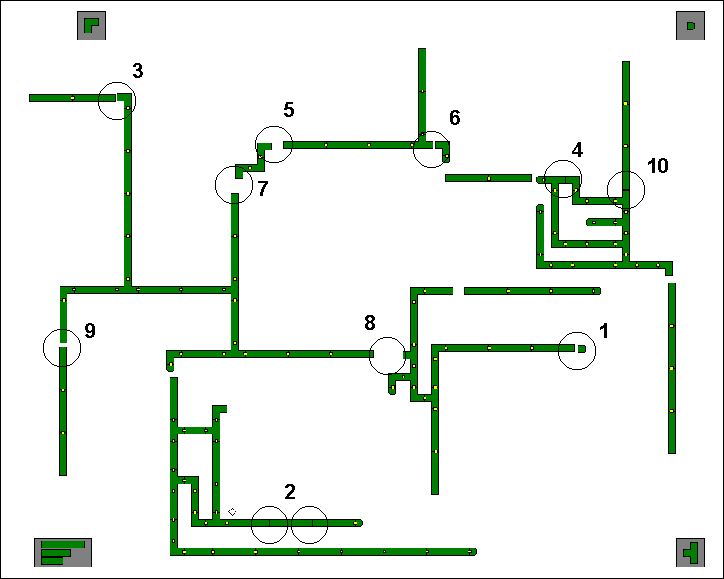 The Follow task involved meeting another person at a specified location. Participants were asked to make ten specific welds on an existing pipe network. One person, the joiner, was given a paper map (Figure 3) showing the locations to be welded, and had to prepare the pipe sections at each place. The other person was the welder, and would follow the joiner to each location and weld the pipe. Since the welder had no map, the joiner was also responsible for ensuring that the welder went to the correct location. The workspace map for the first Follow task, showing the initial pipeline layout and the ten welding sites, is shown in Figure 3. The map also shows the initial state of the workspace at the start of the task.
