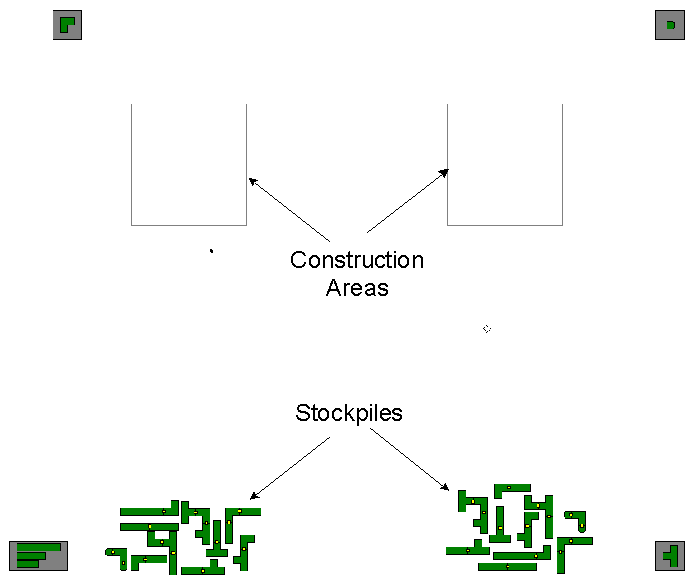 The Copy task involves indicating objects to another person. Participants were asked to construct two identical structures from two existing stockpiles of pipe sections. The stockpiles were located at opposite ends of the workspace. One person, the leader, had a paper picture of what was to be built, and used this to find the next piece in their stockpile. The other person, the copier, did not have the picture, and so had to copy the leaders actions. The leader was responsible for making sure that the copier knew which piece to take next and where to place it. The initial state of the workspace and the first picture of what was to be built are shown in Figure 4.
