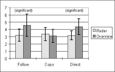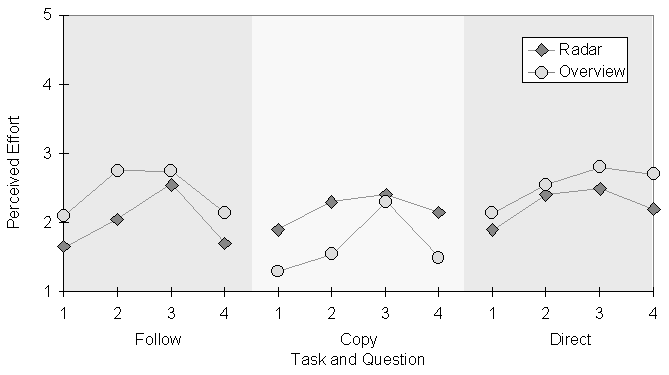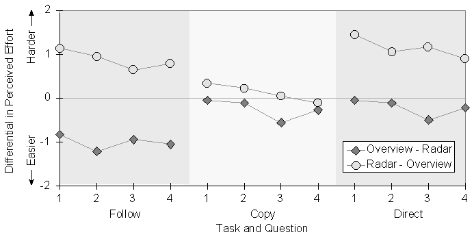 We assumed that as groups became more experienced at each task, they would consider it to require less effort. This was the case when groups used the overview first and the radar second: they felt that the second task was easier. However, when groups used the radar and then the overview, they felt that the second task was more difficult than the first.
