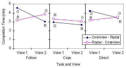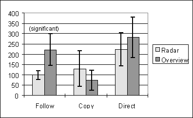 In addition to the between-participants comparison, we wanted to gather preference data; therefore, participants used both the radar and overview interfaces so that they could state which they preferred. The same three measures were taken for the second set of tasks, so that exploratory within-participants analyses could be carried out as well.